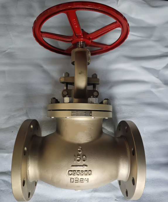 This is a 5-inch Class 150 flanged globe valve precision-cast from ASTM B148 C95800 aluminum bronze, designed for flow regulation and shut-off in corrosive fluid systems. It features a rising stem, bolted bonnet, and handwheel operation for reliable control in marine, seawater, and industrial environments.